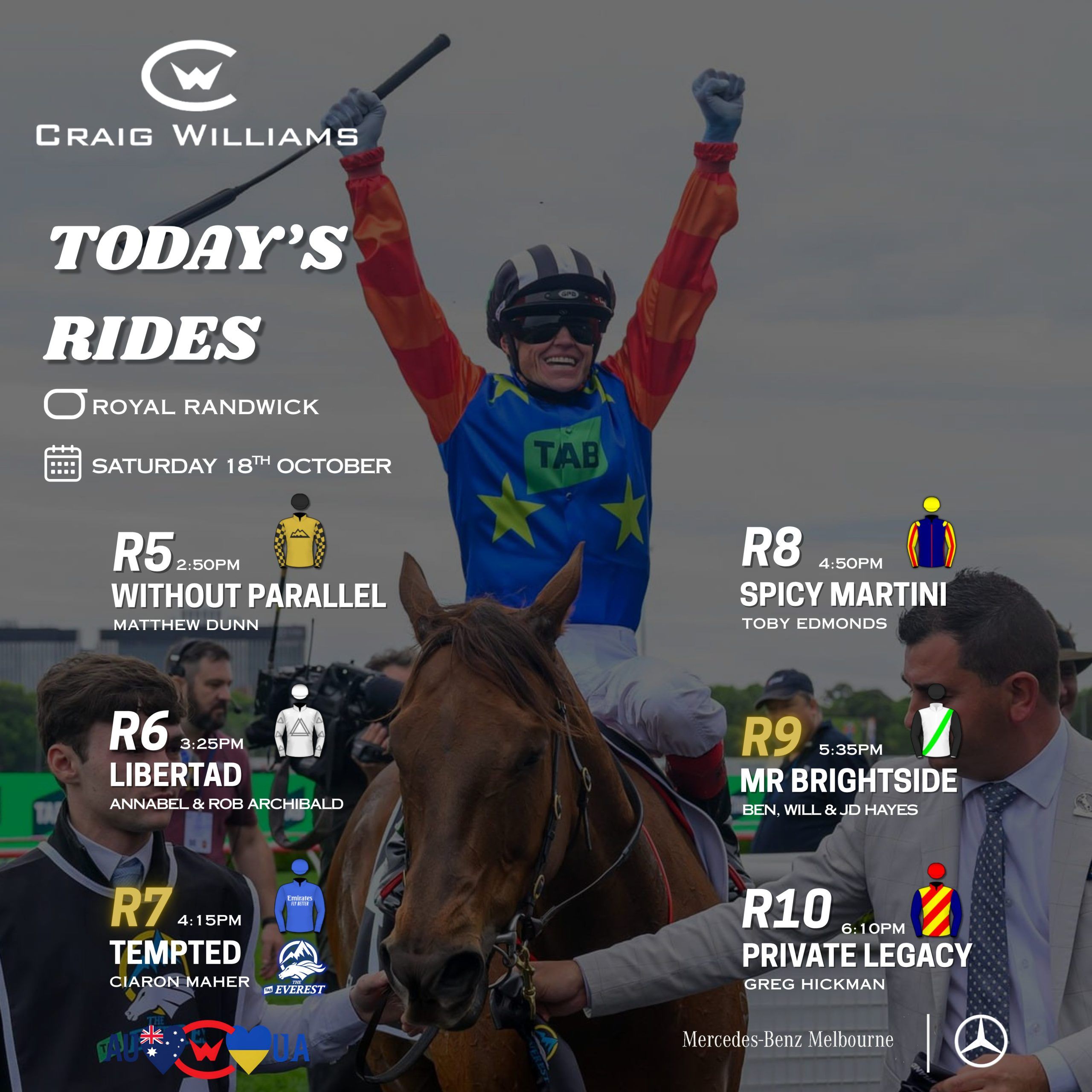 CRAIG’S UPCOMING RIDES Craig’s next meeting will be AT Randwick | DATE – 18/10/2025 Track: Good 4 Rail: Out 3m Weather: Mostly sunny. Max – 20°C Chance of Rain: 10% | Possible Rainfall: 0 mm READ HIS RIDES BELOW @Mercedes-Benz Melbourne